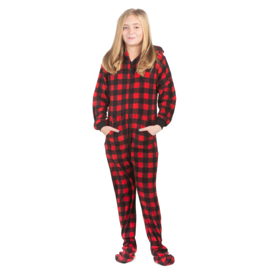 Red & Black Buffalo Plaid Fleece Hooded Footless Onesie Jumpsuit Pajamas for Boys & Girls